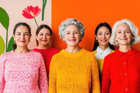 A vibrant group of five diverse women showcasing joyful expressions in colorful sweaters against a bright, floral backdrop, symbolizing friendship and positivity