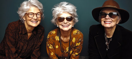 Three Stylish Senior Women in Hats and Sunglasses Sharing a Cheerful Moment on Dark Background