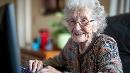 An elderly woman smiling contentedly at her computer screen, having just navigated her insurance details effortlessly.