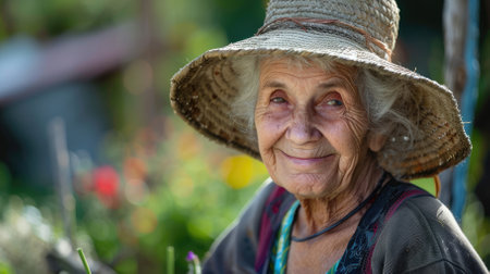 Portrait of a smiling ninety three years old woman with a straw hat under the sunlight.