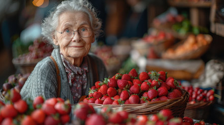 Portrait of an elderly woman with a basket of strawberries at the market