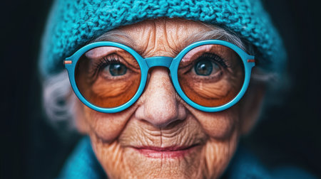 An elderly woman smiles warmly while wearing vibrant blue glasses and a knitted hat. Her joyful expression showcases lines of life and experience on a sunny day.