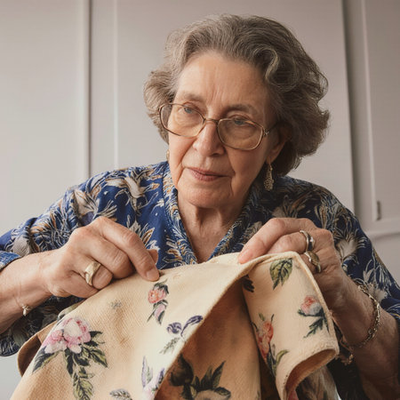 Senior woman in colorful knitted sweater with large glasses, expressing deep emotions and wisdom, sitting in a bright indoor setting