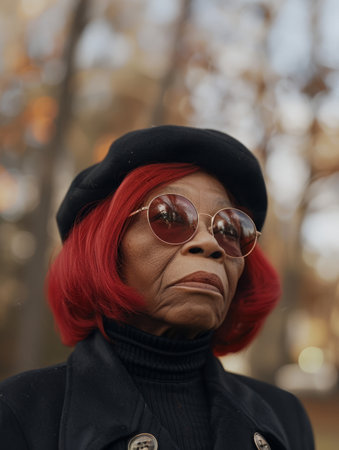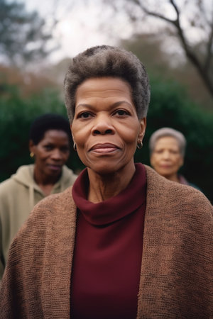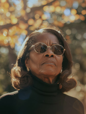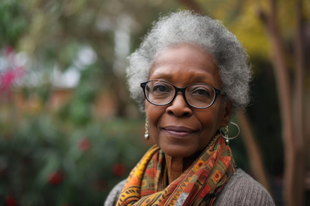 Tranquil and confident african american senior woman with glasses. Enjoying a peaceful moment outdoors in a garden. Wearing a stylish autumn scarf. Exuding wisdom and experience