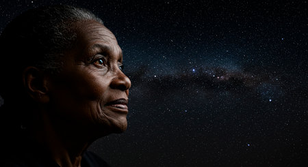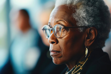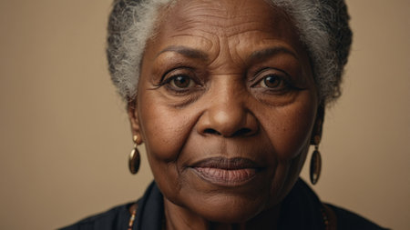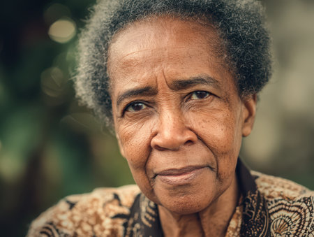 Portrait of an elderly woman with wisdom in her eyes, showcasing resilience and strength in a serene setting