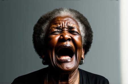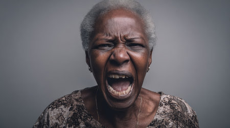 Close-up portrait of furious senior black woman shouting with wide open mouth against gray background