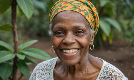A woman in a colorful headscarf smiles brightly in a lush garden setting