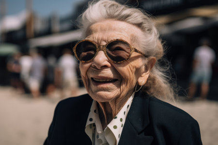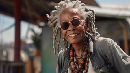 A cheerful lady old black woman wearing sunglasses on street. Generative ai