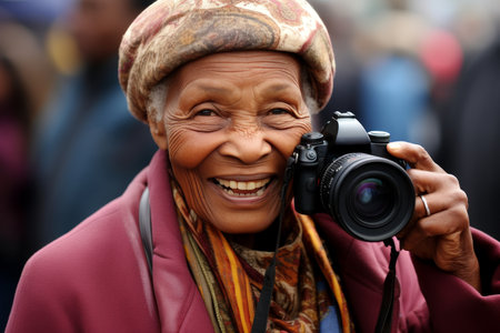 Senior holding a camera, community initiatives, helping the elderly, charity, youth centers