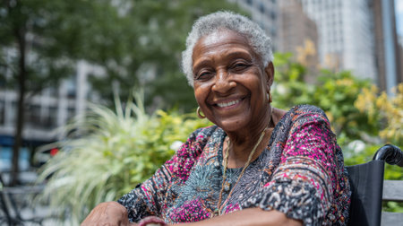 An elderly woman sits in a city park beaming with joy amidst greenery and flowers around her.