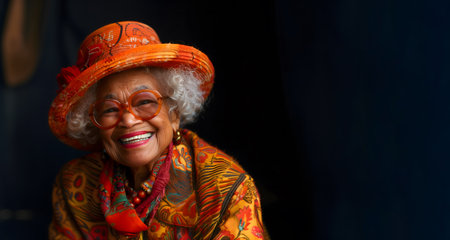 Radiant elderly black woman with colorful hat and glasses smiling warmly
