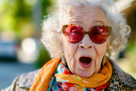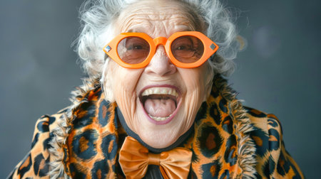 An excited elderly woman wearing vibrant orange sunglasses and a playful bow tie joyously screams at the camera, showing her unique Halloween spirit.