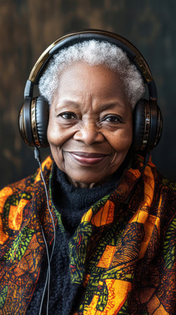 An African American grandmother joyfully listening to music with headphones on, against a rich dark chocolate background, symbolizing music enjoyment or learning with a personal touch