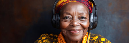 A happy African American grandmother wearing headphones on her head, with a dark chocolate wall backdrop, illustrating the blissful concept of music enjoyment or learning for all ages, banner