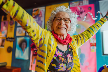 An elderly woman is delightfully dancing, raising her arms in a lively, colorful atmosphere, exuding joy and enthusiasm in a vibrant setting