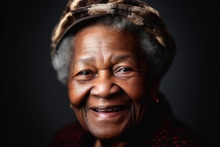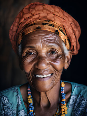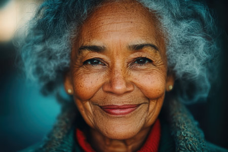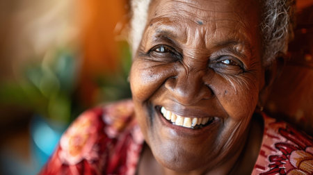 A captivating close-up portrait of an elderly woman reflecting joy and wisdom through her smile. This image beautifully captures the essence of aging and life experiences.