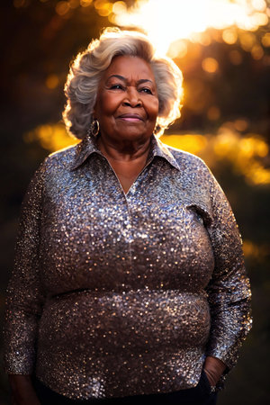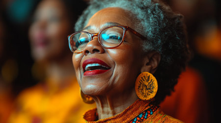 Heartwarming portrait of a gleeful elderly woman, radiant in vibrant mood lighting. ideal for diverse representation. A.I.