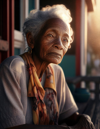 Elderly woman with silver hair sits on a balcony, bathed in the golden light of the setting sun. She gazes into the distance with a thoughtful expression. Her weathered face tells stories of a life well-lived
