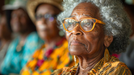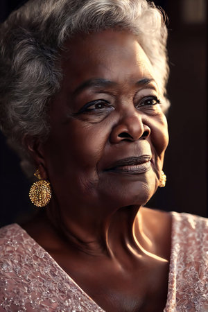 Mature elderly black woman wearing traditional clothes. Creative stylish portrait of aged african woman. Created with Generative AI