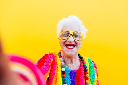 Funny grandmother portraits.granny fashion model on colored backgrounds