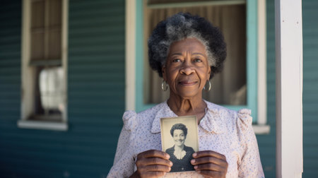 seventy-year-old woman holding a photo of herself in her youth against the background of the house