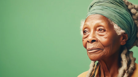 Elegant, elderly pensioner, chic African American woman with gray long hair, green background, banner. Advertising of cosmetic products, spa treatments, shampoos and hair care products, dentistry and medicine, perfumes and cosmetology for women
