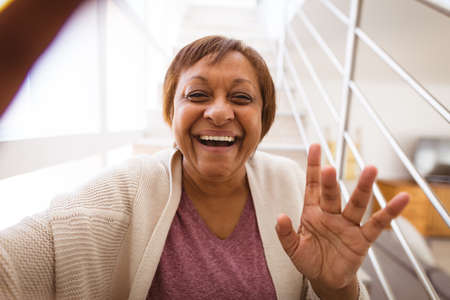 Cheerful african american senior woman waving hand during video call by railing at home. lifestyle and communication.