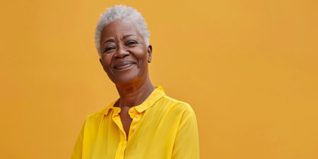 a Black elderly person in a yellow blouse, looking content with a gentle smile on a yellow studio background