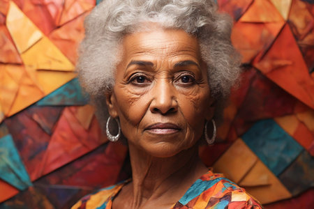 Gorgeous beauty old woman african american close up portrait on Abstract trianglify colorful background. Granma, grandmother, granny