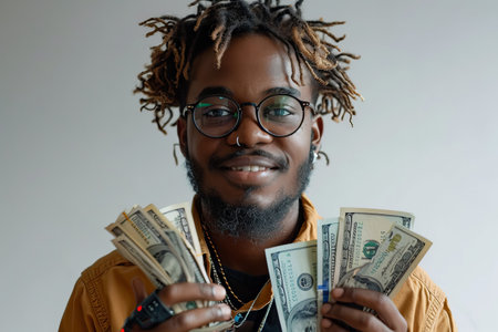 Cheerful young man displaying multiple dollar bills, exuding success and happiness in a casual setting.
