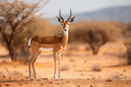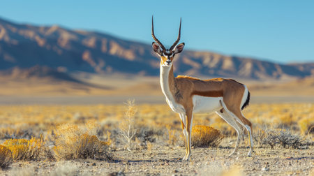 A graceful antelope standing in a vast desert landscape with mountains in the background, showcasing wildlife