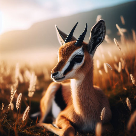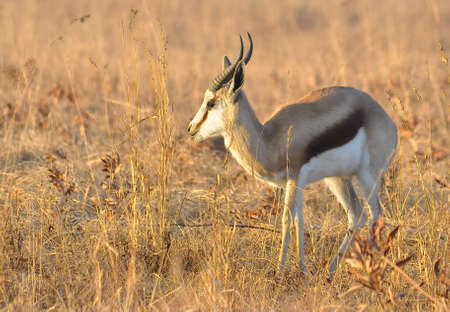 A graceful springbok antelope stands alert in a golden grassland savanna, its coat blending with the sunlit landscape. Wildlife Animals.