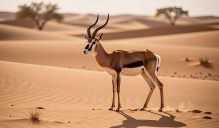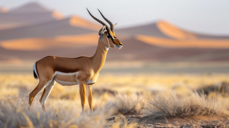 A gazelle poses gracefully against the backdrop of golden sand dunes, basking in the warm sun. Sparse vegetation adds to the tranquil beauty of this desert scene, creating a peaceful atmosphere.
