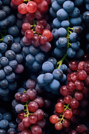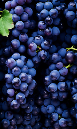 Close-up of ripe blue wine grapes on vine, vineyards in autumn harvest. Fruits in fall. beautiful red grapes ready for harvesting