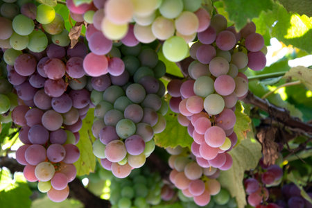 Bunches of white-pink sweet seedless table grapes ripening on vineyars of Cyprus, nature background