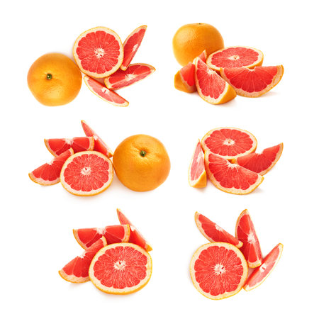 Sliced grapefruit and fresh whole on white background.