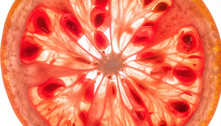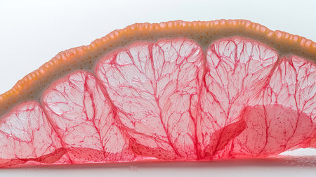Macro shot of a grapefruit slice, translucent pulp illuminated against a bright white surface, emphasizing its natural freshness.