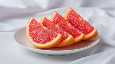 Enjoy the vibrant beauty of fresh pink grapefruit slices arranged on a white plate, perfect for health-focused meal planning and refreshing snack choices.