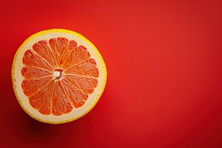 Fresh grapefruit slice on a vibrant red background, showcasing its juicy texture and vibrant color, perfect for food related concepts, healthy lifestyle themes, and bright imagery