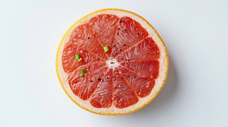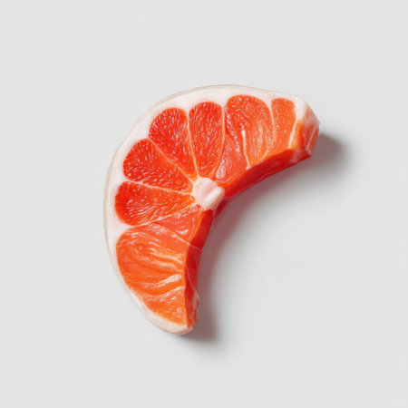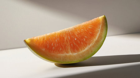A colorful slice of fresh citrus fruit placed on a clean white background. This close-up image highlights the vibrant textures and juicy segments, perfect for healthy eating themes.