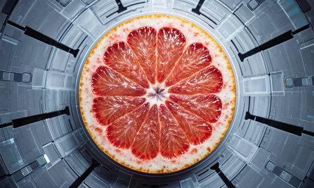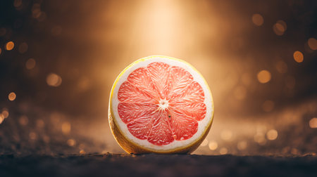An AI generated illustration of half of a ripe grapefruit isolated on an orange background