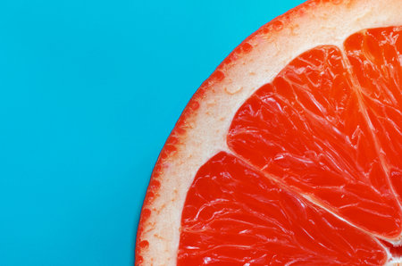 Vibrant grapefruit slice with juice droplets on turquoise background