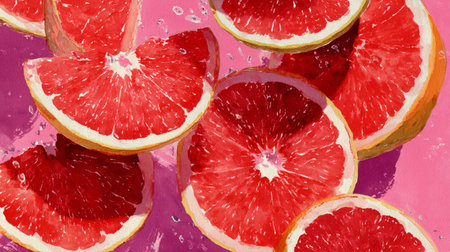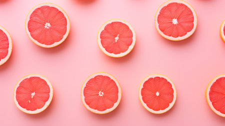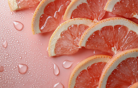 Fresh grapefruit slices are delicately arranged on a pink background, showing their juicy texture and vibrant color, enhanced by small water droplets that add freshness.