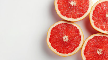 Four vibrant grapefruit halves on a white surface create a fresh visual, perfect for creative projects or culinary ideas.