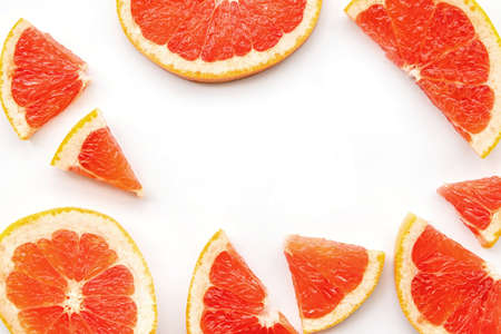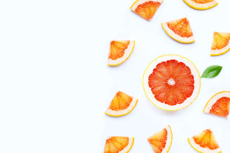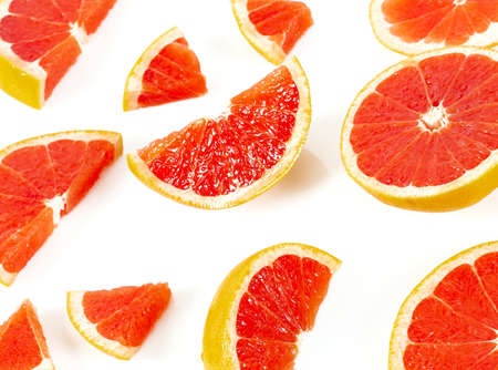 Composition of slices of citrus fruit of red grapefruit on white background, close up