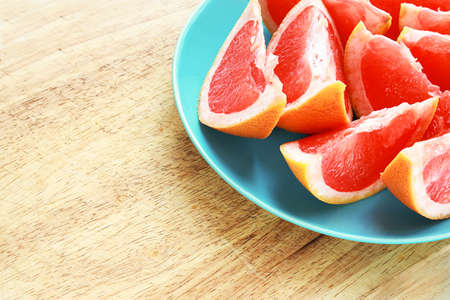 Grapefruit slices on pink plate on wooden table with selective focus, top view. Fresh citrus fruit for healthy eating snack