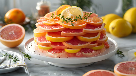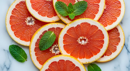 Grapefruit slices mint leaves arrangement fresh citrus fruit. Healthy lifestyle concept citrus slices close-up. Marble background grapefruit composition. AI Generative AI generated