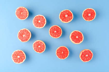 Grapefruit pattern on white background. Top view. Creative design, minimal flat lay concept. Summer time. Tropical travel, exotic fruit. Vegan and vegetarian food