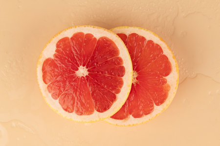 Grapefruit slices on a beige background. Top view.