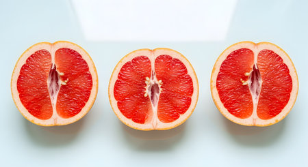 Three halves of pink grapefruit are arranged in a symmetrical row against a clean, light blue background. The flat lay composition highlights the vibrant color, juicy texture, and freshness of the citrus fruit.